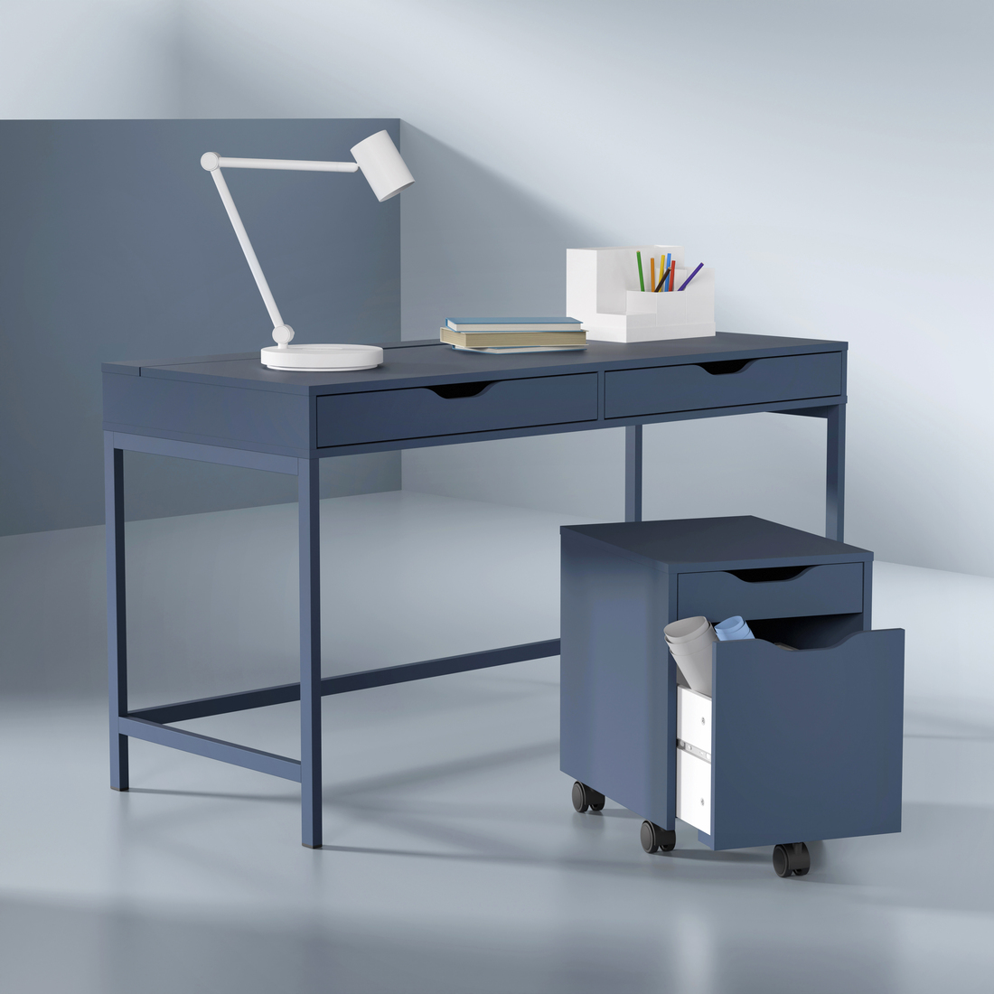 Escritorio ALEX azul con dos cajones, estilo minimalista, patas metálicas, forma rectangular.