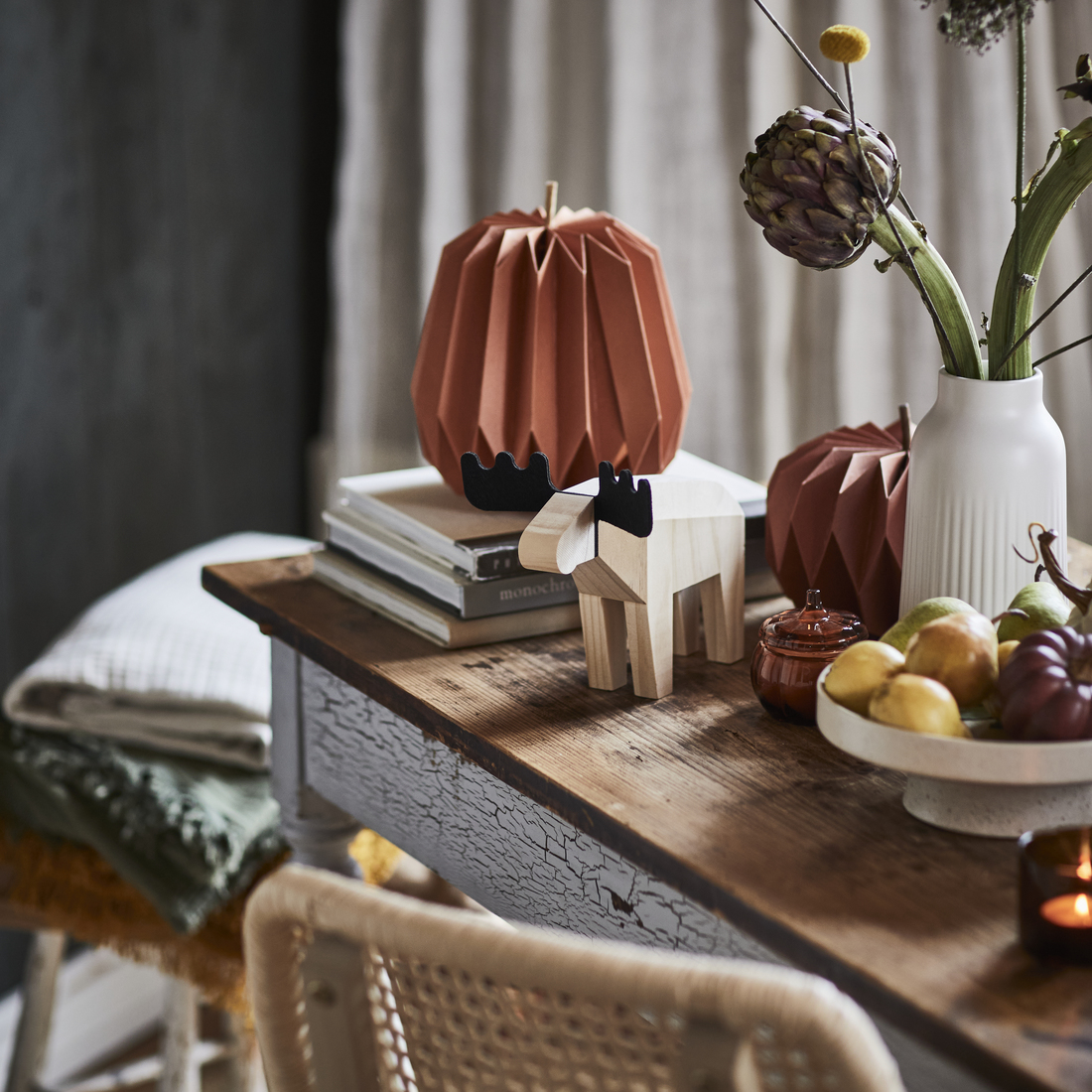”I like challenges and was delighted when I was given the task of creating a decoration for the HÖSTAGILLE collection that would feel as typically Swedish as the Dala horse. My choice fell on another animal associated with Sweden – the moose. Together with the team at our model shop, I experimented with different body shapes, leg lengths and horn positions to find the right design. I hope my playful version of the noble king of the Swedish forest makes you smile.”