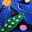 This cushion cover’s striking pattern has big flowers on a black background, making the colors stand out. The leaves’ edges have running stitch embroidery – a tactile element that you can see and touch.