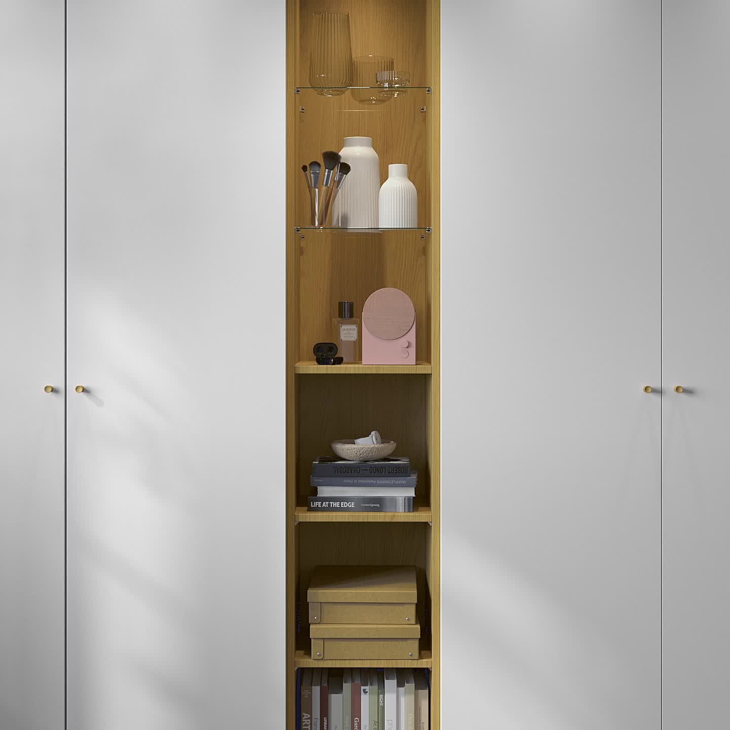 Add this mid-unit to your PAX wardrobe, allowing you to both display and store your favorite clothing and accessories. Several adjustable glass and wooden shelves let you customize your space.