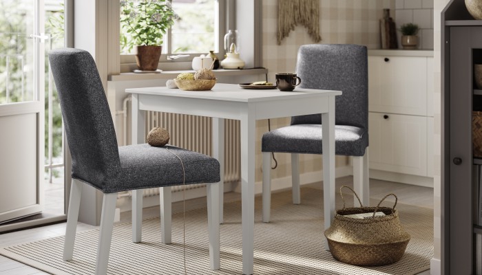El taburete de bar BERGMUND está disponible con patas blancas y negras, y sus fundas a medida vienen en diferentes modelos, colores y materiales. Tú decides el estilo.
