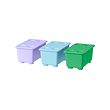 Estas 3 cajas con tapa, vistosas y apilables, son muy útiles para guardar juguetes pequeños y accesorios de escritorio cuando no se usen. Está hecha de resistente plástico, con al menos un 50% de contenido reciclado.