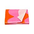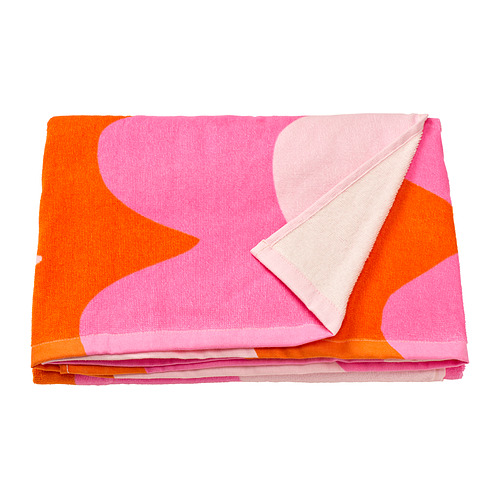 Una toalla de playa con un estampado ondulado en rojos y rosas, hecha de 100% algodón con rizo en un lado y una tela aterciopelada en el otro. Es lo suficientemente grande para envolverte en ella, y queda genial con los muebles de exterior STRANDÖN.