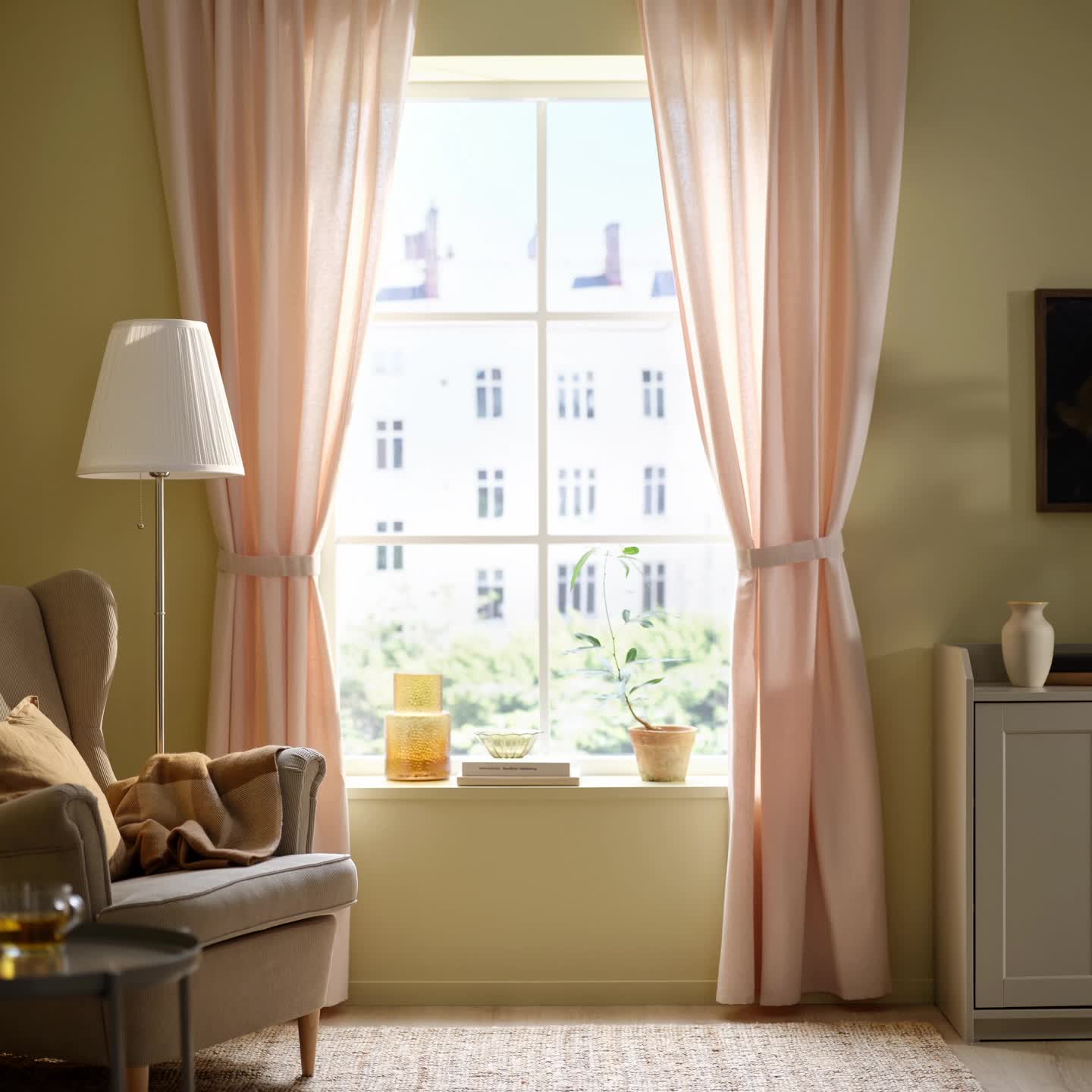 Las cortinas LENDA en algodón de color rosa claro con cinta de fruncir tienen una textura acanalada que les aporta carácter. Ideales para salas o dormitorios, también para soluciones con varias capas. Las tiras le dan un toque decorativo.