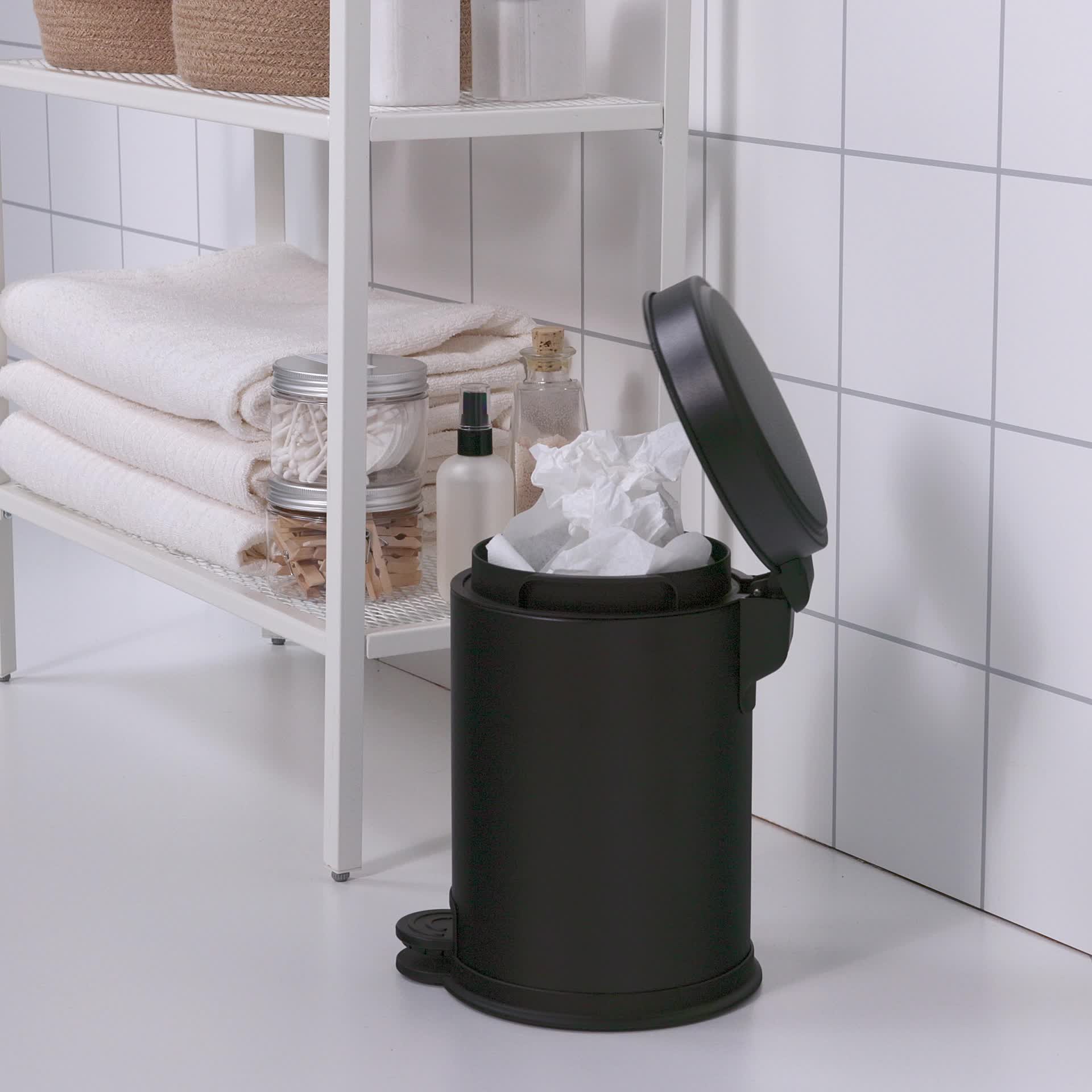 Este cubo con pedal de cierre suave es silencioso y realza el estilo del baño o cualquier otra estancia donde lo pongas. El acabado mate y los bordes redondeados combinan a la perfección con la serie de baños VALASJÖN y FRÖSJÖN.