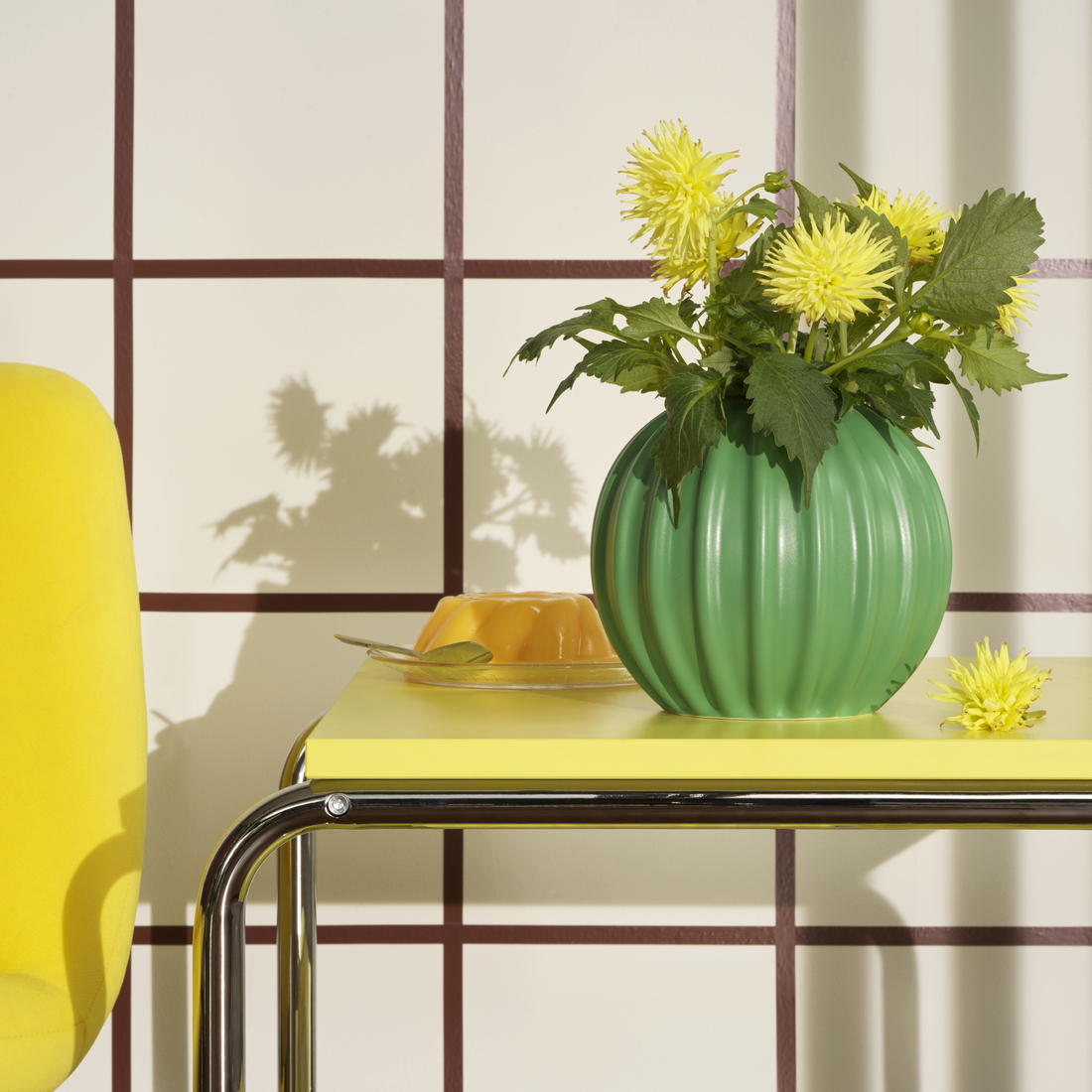 Para el relanzamiento, hemos aprovechado la oportunidad de actualizar el material de cerámica con sílex a cerámica vidriada. También hemos cambiado la apertura del florero para que tenga forma anular y hemos renovado los colores.