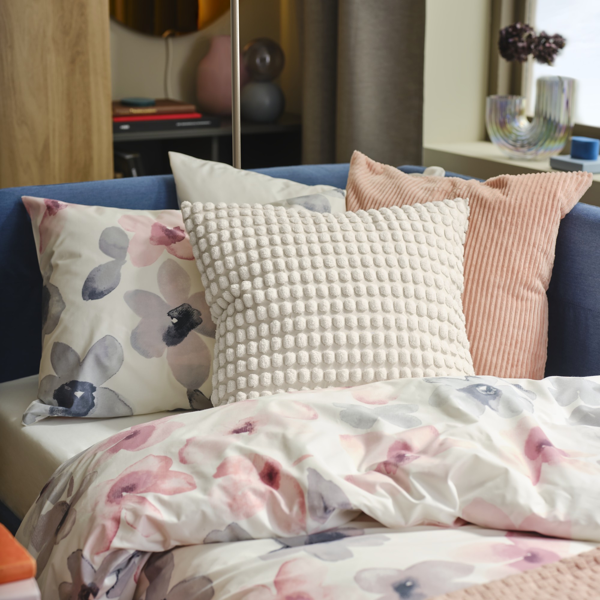 Una funda de cojín muy suave en color hueso con textura que realza los diferentes tonos del pelo y la base. Elige unas cuantas del mismo color o combínalas. Está hecha de poliéster reciclado.