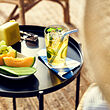 Vaso de té helado con menta sobre una mesa, junto a un plato de rodajas de melón y uvas.