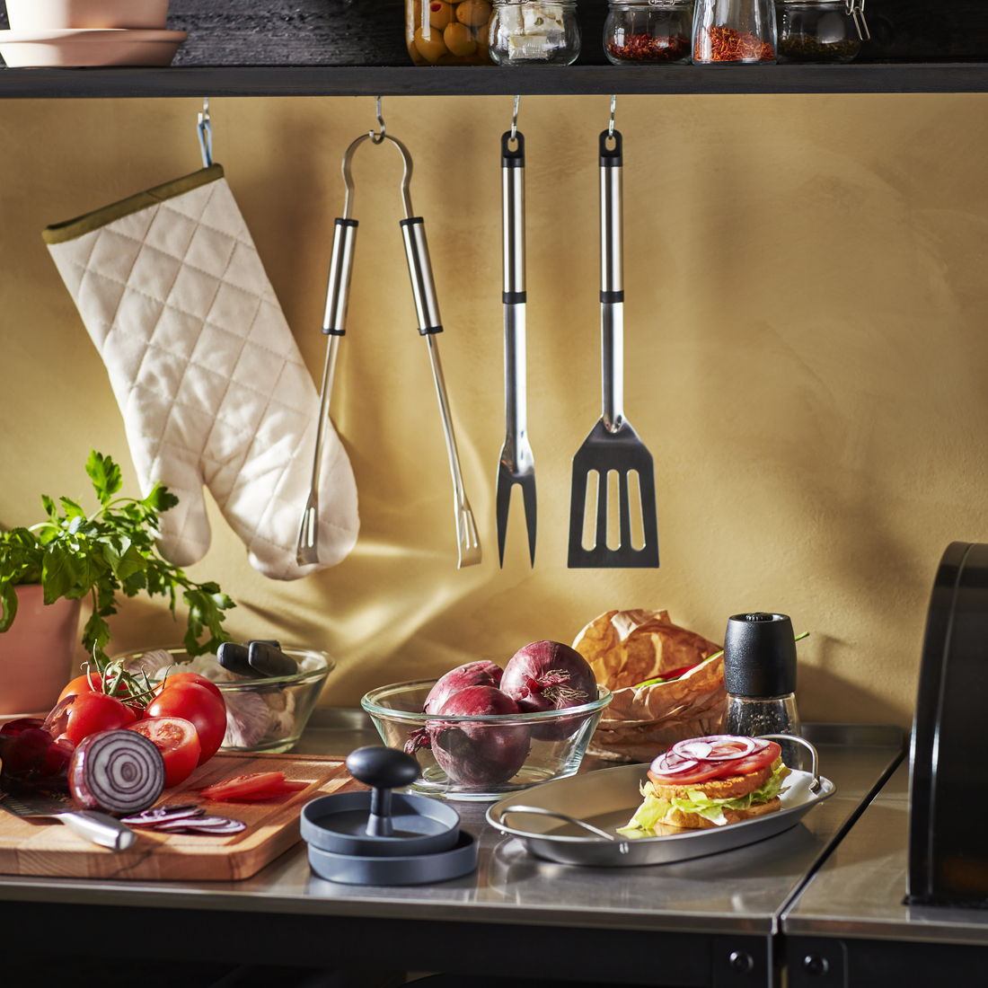 On the shelves under the grill there is space for accessories, utensils, serving platters and other things you need in order to serve smoking hot food directly from the grill to the table.