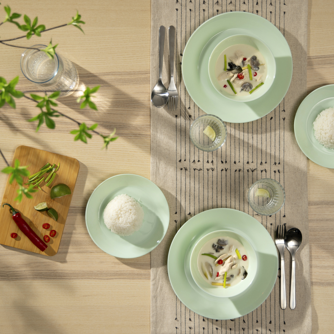 The tableware's shade of green creates a warm and inviting atmosphere.