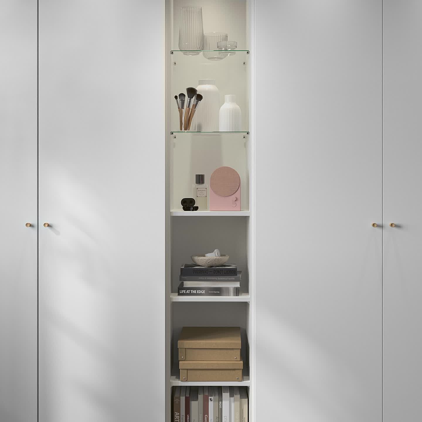 Add this mid-unit to your PAX wardrobe, allowing you to both display and store your favorite clothing and accessories. Several adjustable glass and wooden shelves let you customize your space.