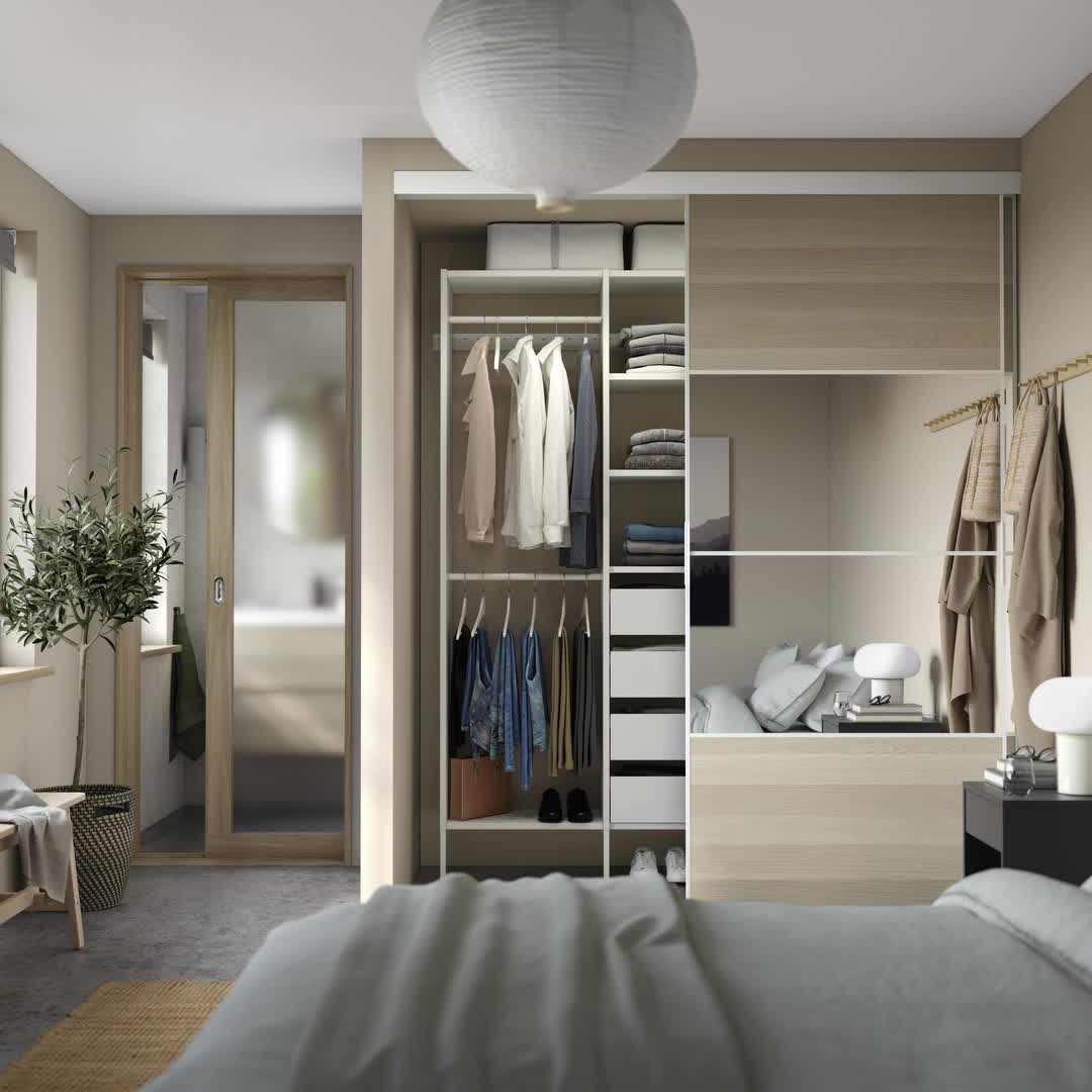 SKYTTA / AURDAL walk-in wardrobe with sliding doors, white AURDAL / MEHAMN white stained oak effect / AULI mirror glass, 79 1 / 2 "x45 1 / 4 "x94 1 / 2 "