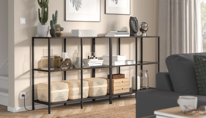 You can place beautiful books, green plants and other decorative items on the glass shelves and use the walnut shelf for things you want to keep within easy reach – or the other way around.