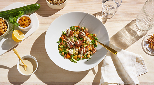 Ensalada de garbanzos con albóndigas y aliño de tahini