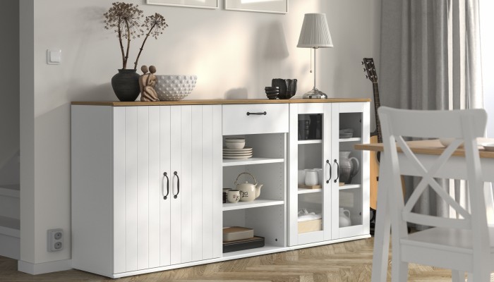 Coloca tus objetos favoritos en la parte superior del aparador para exhibirlos y oculta los artículos que suelen desordenarse en el cajón o detrás de la puerta.