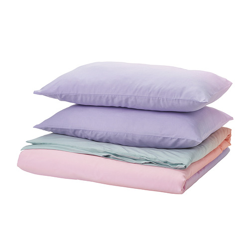 With vibrant shifting shades, FLÄDERBUSKE duvet cover set brings a playful vibe to your room. Made from a lightweight, wrinkle-resistant polyester/viscose blend, it keeps your bed looking bright and fresh.