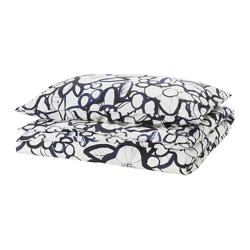 HÄRLIR duvet cover and pillowcase(s), white black / blue floral pattern