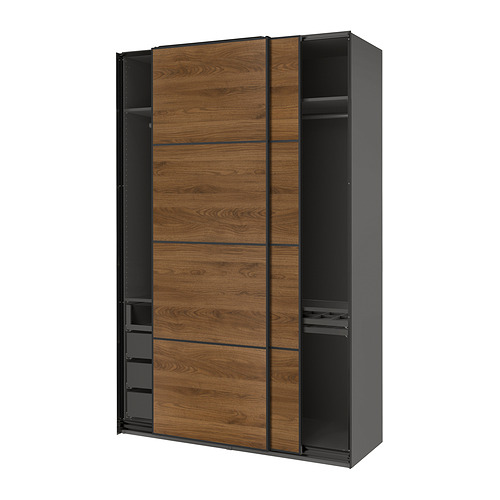 PAX / MEHAMN wardrobe with sliding doors, dark gray black / double sided walnut