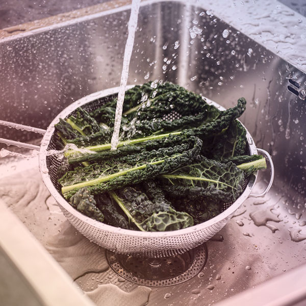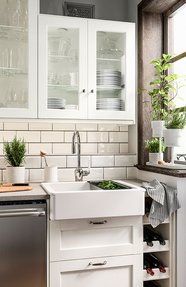 Herbs growing in the windowsill, a cullender in the sink so you can wash your delicious, healthy greens as you harvest them. This clean and tidy kitchen atmosphere is created by the white cabinets and sink that almost melt into the classic tiled walls for a fresh mood with great functionality.