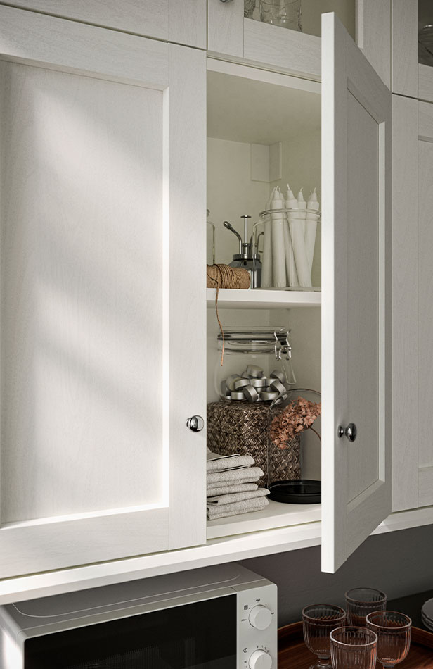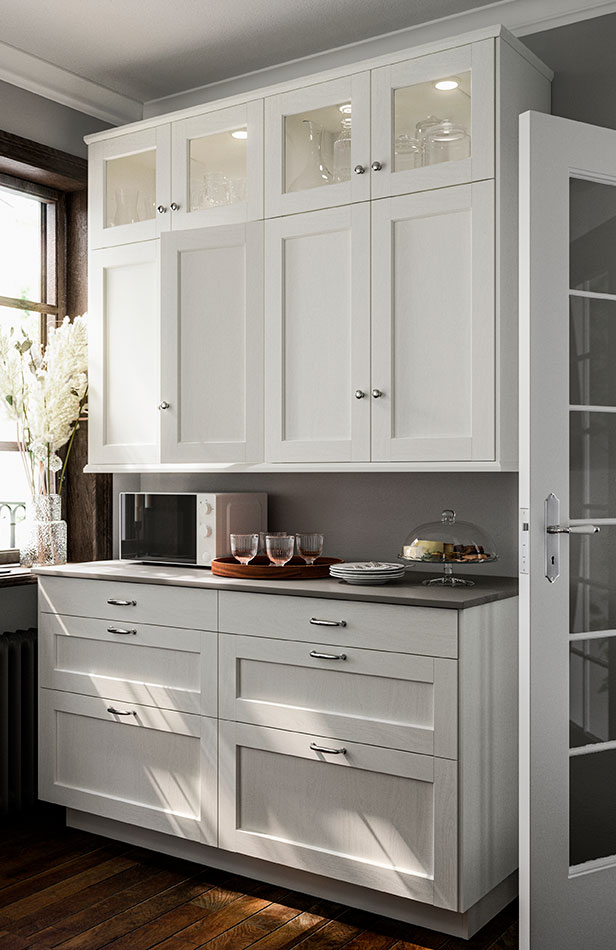 These white storage cabinets combine for a complete sideboard offering all the kitchen storage you could need. Drawers for cutlery and wall-mounted cabinets for plates, cups, saucers or even candles or kitchen towels. The combination of wooden and glass doors provides uncluttered storage or display.