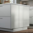 This cover panel with a thin frame matches ASPUDDEN fronts in light grey, extending the design to the sides of base cabinets. With minimalist appeal, the series brings a timeless look to your kitchen.