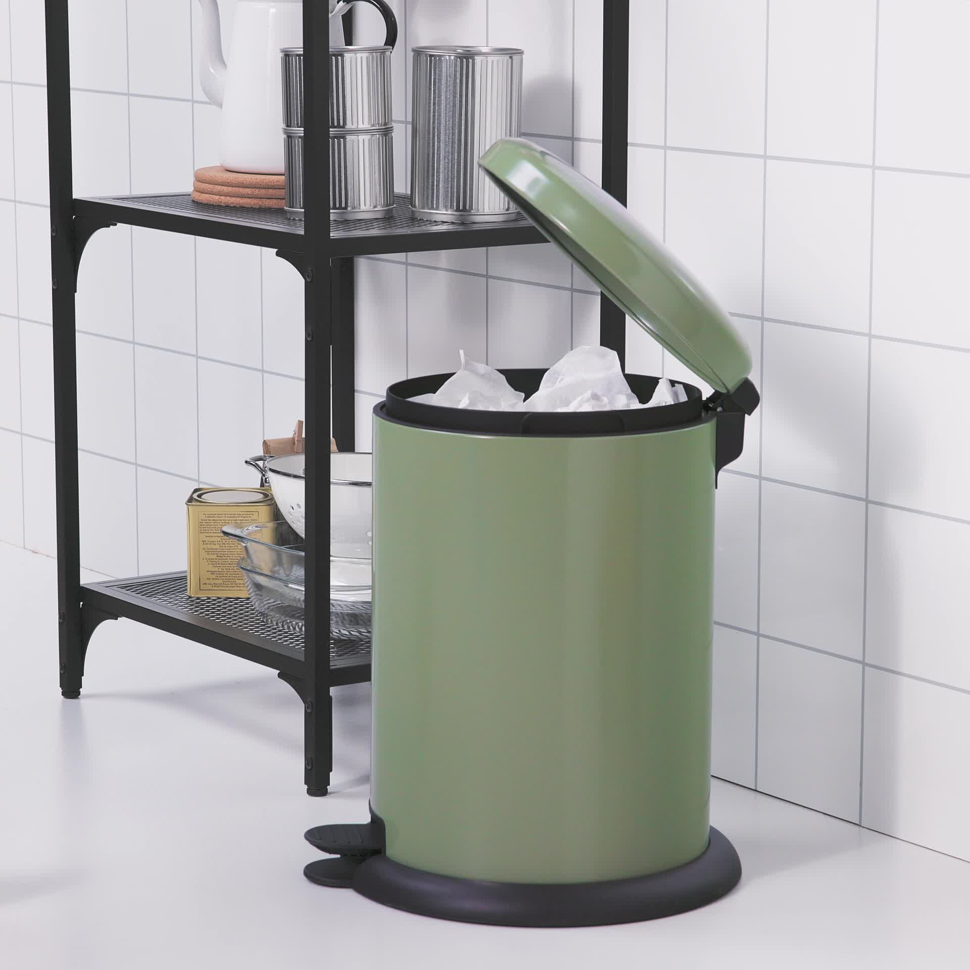 Cubo de basura verde oliva con tapa y pedal en la cocina junto a estantería metálica con artículos.