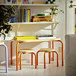Pequeño conjunto de muebles GREJSIMOJS naranjas con asientos de madera y patas de acero, colocados debajo de un estante blanco con artículos coloridos.