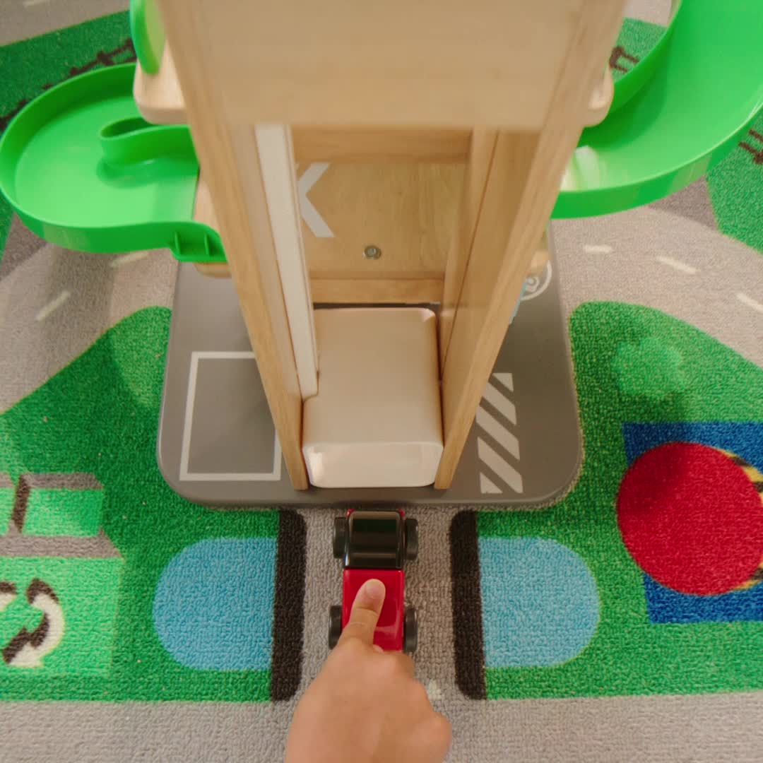 Go down the ramps, charge the car, fix it in the repair shop or drive into the car wash – exciting details that inspire play and learning. Does the car need a rest? Use the elevator to park it for a while!
