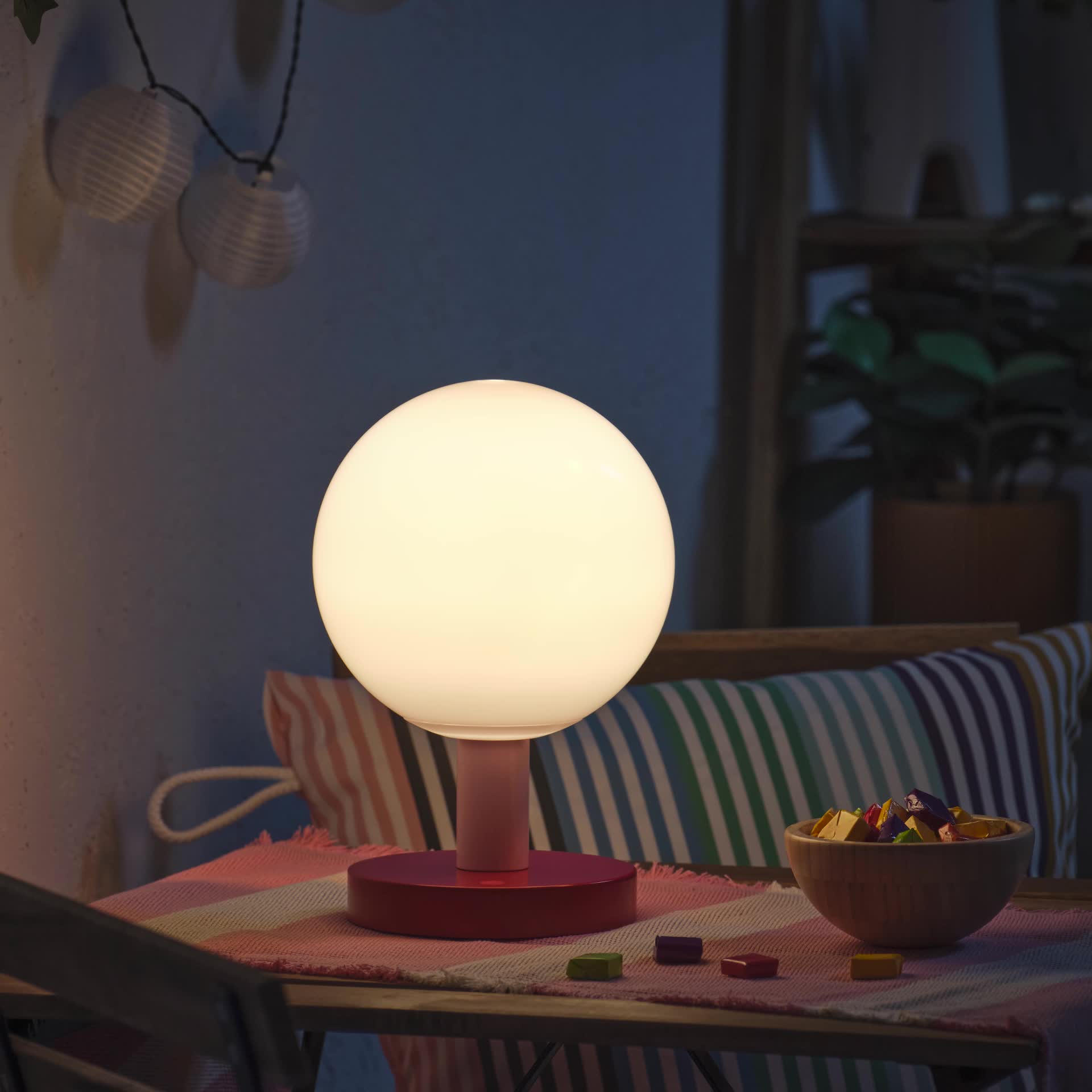 Spot lighting creates that cozy vibe that makes you really feel at home on your balcony or outdoor space. This playful lamp has a white globe on a red base and charges easily via a USB-C cable.