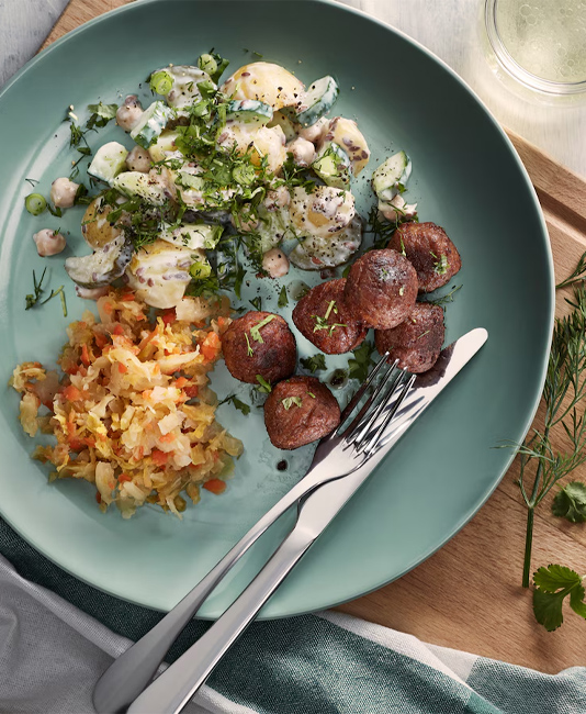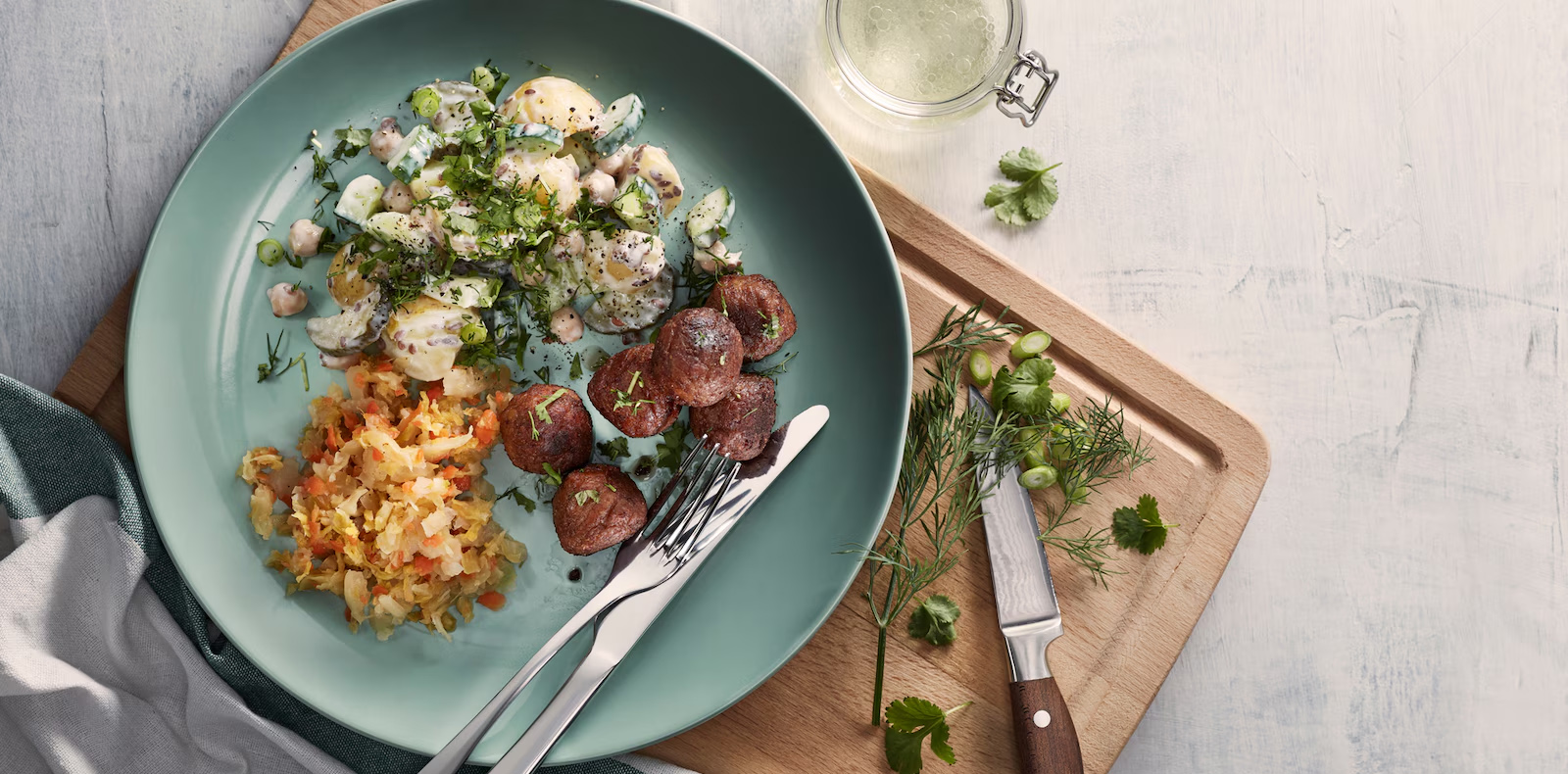 Boil the unpeeled potatoes with a pinch of salt. Let cool. Quarter the potatoes and mix with the rest of the ingredients for the salad in a bowl.